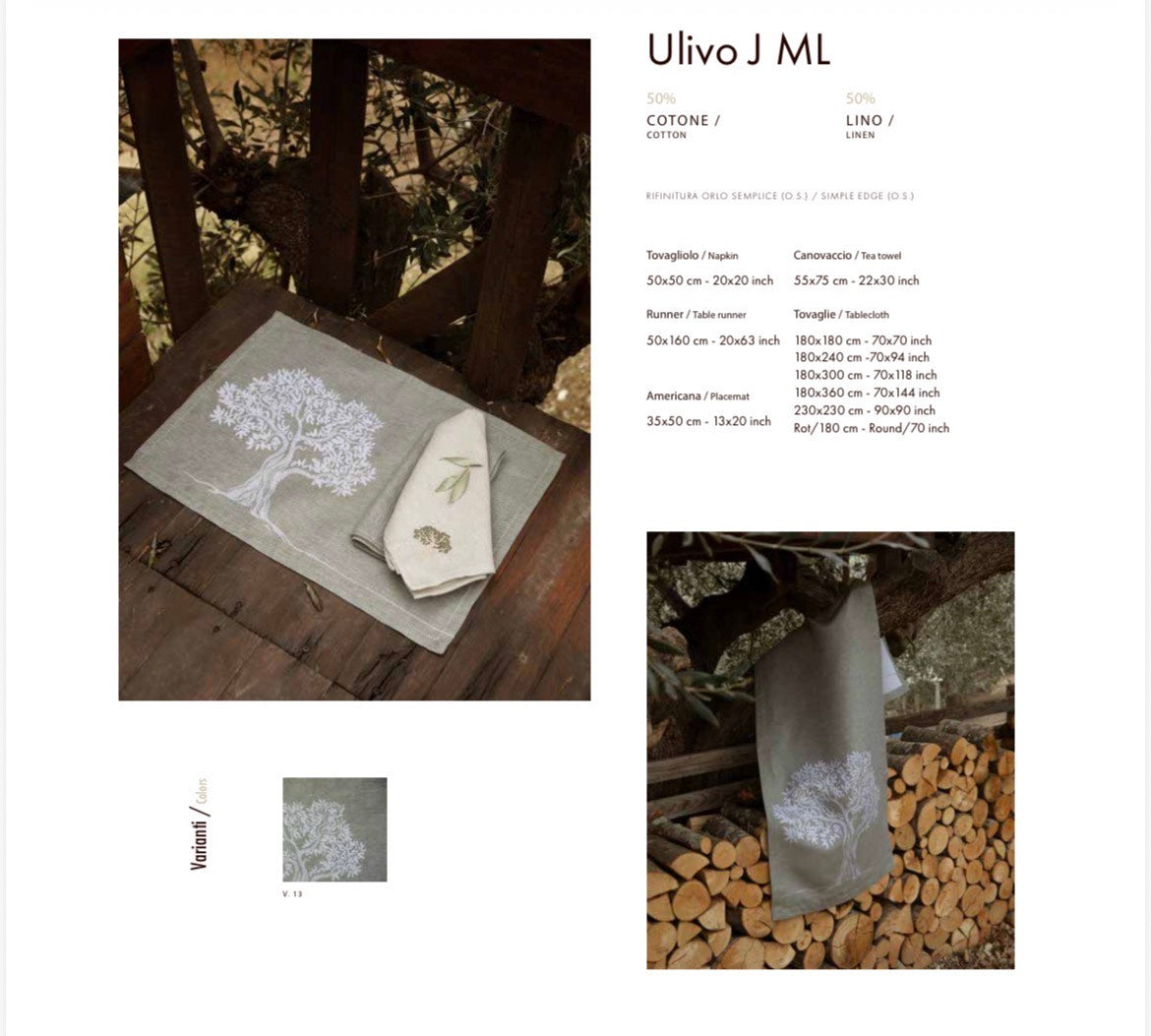 Elegante tovaglia rotonda che porta il fascino della campagna toscana direttamente sulla tua tavola. Realizzata in pregiato lino e cotone con trama jacquard, presenta un delicato motivo di ulivi che cattura la luce in modo affascinante. Disponibile in tonalità verde naturale o grigio sofisticato, il diametro di 180 cm la rende perfetta per cene conviviali e momenti speciali. Un pezzo versatile che trasforma ogni pasto in un'occasione indimenticabile, unendo praticità e bellezza con quel tocco di autenticità che solo i tessuti naturali sanno regalare.