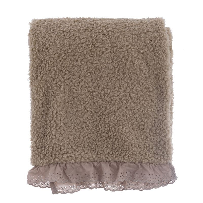 Add a touch of charm to your space with the Blanc Mariclo plaid featuring playful San Gallo trina lace. Soft and cozy, it brings warmth and a hint of whimsy to your décor, perfect for snuggling up or brightening your room with its delicate elegance. 500 gsm